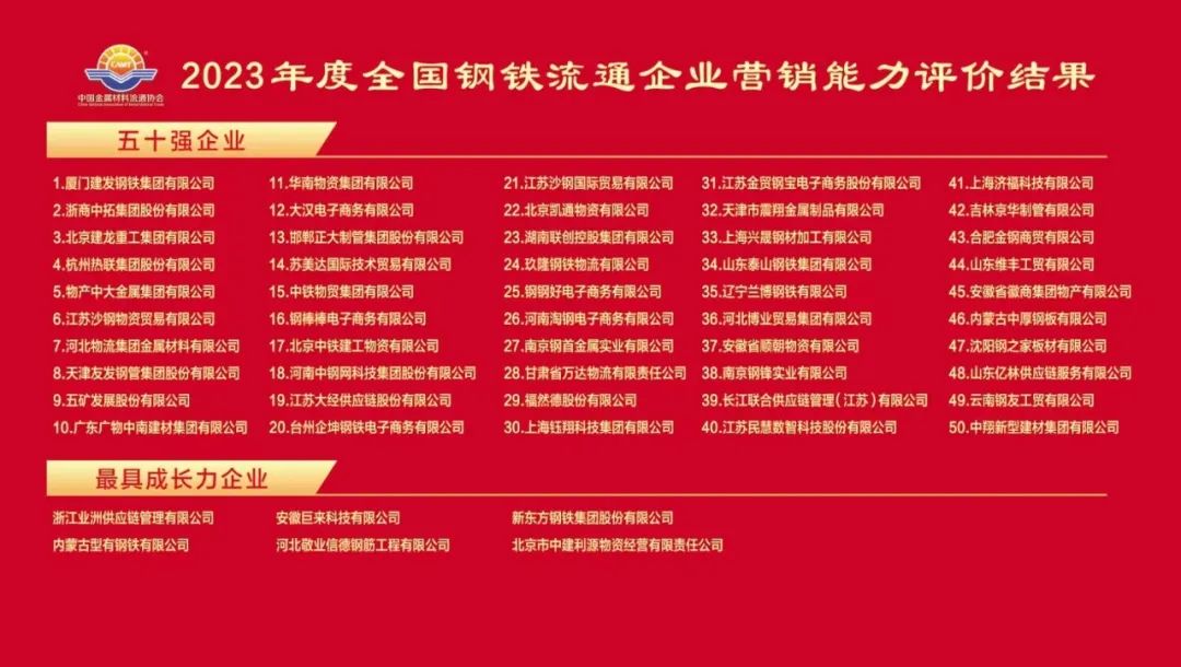 大會同期舉行的“2023年度全國鋼鐵流通企業(yè)營銷能力評價結(jié)果(五十強企業(yè))發(fā)布與頒獎儀式”,廈門建發(fā)鋼鐵集團有限公司等五十家會員單位獲得了“五十強企業(yè)”的殊榮。